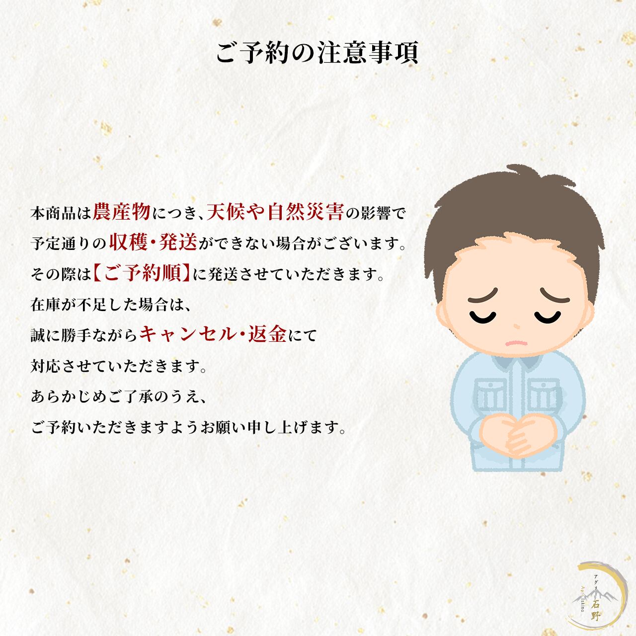 本商品は農産物につき、天候や自然災害の影響で予定通りの収穫・発送ができない場合がございます。